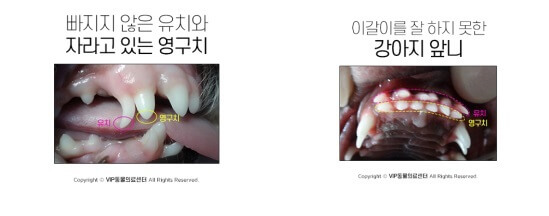 특히 송곳니 부위는 잔존 유치가 남기 쉬운 위치다. 영구치가 올라왔는데도 유치가 그대로 남아 있다면, 음식물이 끼기 쉽고 치아 배열이 틀어질 수 있다. 생후 7개월 전후가 되었는데도 유치가 빠지지 않았다면, 동물병원에서 확인을 받아보는 것이 좋다.